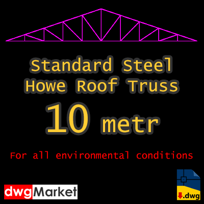 This dwg file is a pre-designed CAD drawing with structural details of a 10m long Howe roof truss. A standard truss with strength conditions that is technically and engineeringly responsive and can be constructed anywhere.