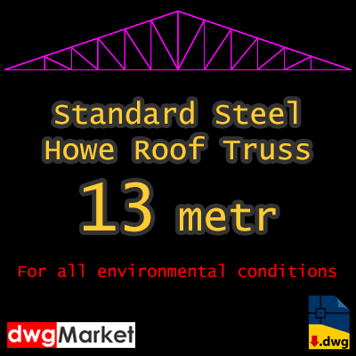 This dwg file is a pre-designed CAD drawing with structural details of a 13m long Howe roof truss. A standard truss with strength conditions that is technically and engineeringly responsive and can be constructed anywhere.